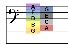 다음은 낮은 음자리표인데요, 낮은 음자리표는 낮은 음악대의 악기를 위해 자주 쓰인다네요. 낮은 음자리표는 F의 자리를 정해줍니다. 마찬가지로 다음을 참고하시면 편합니다.