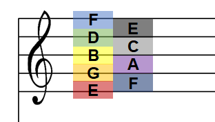 그리고 눈에 띄는 첫 기호가 바로 음자리표입니다. 이 음자리표에도 종류가 있는데요, 여기서는 두 가지 대표적인 자리표의 종류와 생김새만 알고 넘어가도록 합시다. 위에 있는 기호의 이름은 높은 음자리표(treble-clef)입니다. 의미는 G 음의 자리를 정해준 다고 합니다. 이전에도 "도레미~"를 "CDE..."으로 나타낸 것에 대해 배웠습니다. 그것을 기준으로 높은 음자리표가 각각의 칸들의 위치에 따른 음의 위치를 정의해줍니다.