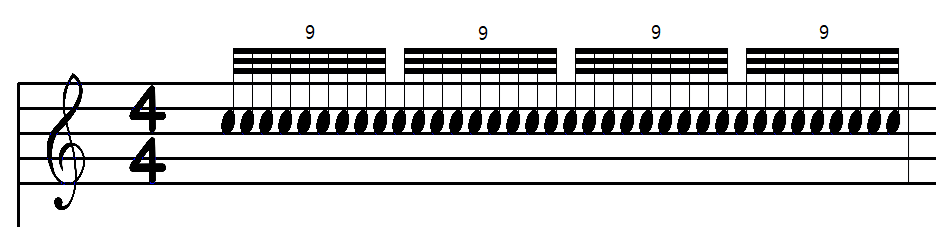 16분 음표가 8개 있으면 1비트였죠. 즉, 예시에서 1개의 32분 음표가 나타내는 비트는 1/8 비트였습니다. 난 홀수로 쪼개고 싶은데? 그럼 9로 쪼개야지요. 오! 그러면 9잇단음표를 쓰면 9개의 32분음표가 1비트가 되겠습니다.