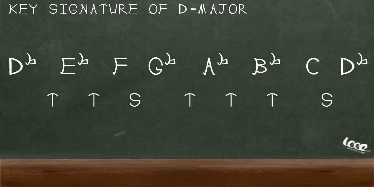 따라서 C-major의 조성에 맞추기 위해서 샾과 플랫을 이용하면 위의 음계 구성은 다음과 같습니다.