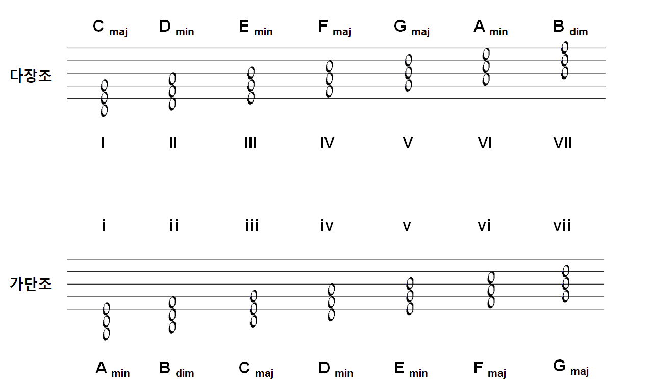 * 로마 문자를 이용하여 대문자는 다장조, 소문자는 가단조로 표시하였습니다. (실제 기호와 다를 수 있어요!!!)