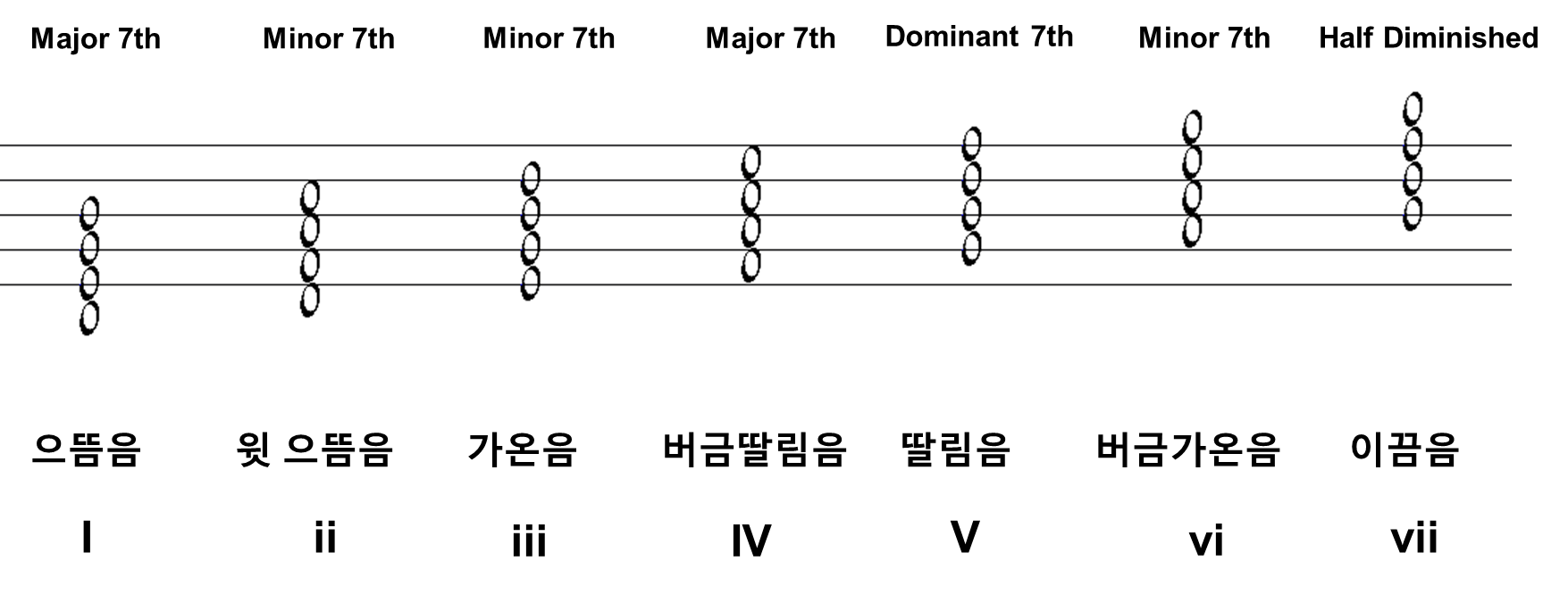 기존의 3화음 음을 하나 더 쌓아 올리면 다음과 같이 화음의 이름에 맞는 4음 화음을 구성하실 수 있습니다!