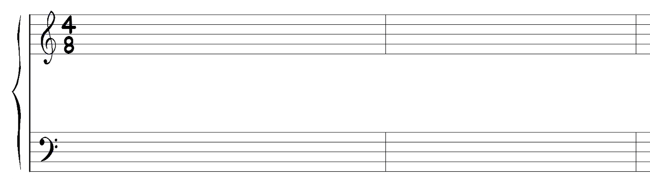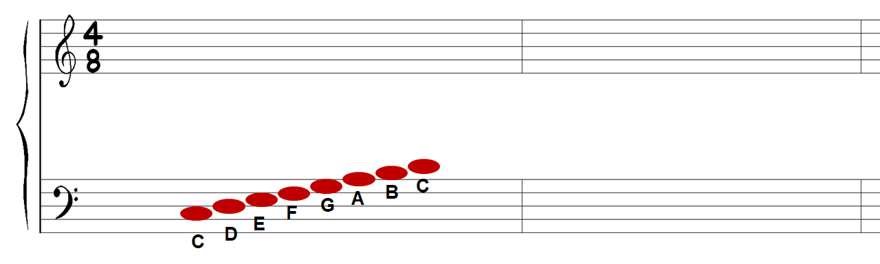 모두 그런 것은 아니지만, 보편적으로 아래의 오선지에는 낮은 음자리표를 사용합니다. 낮은음자리표가 F음을 정해주기 때문에 두 오선지 안에서 2옥타브 범위를 수월하게 연결하여 표시할 수 있습니다.