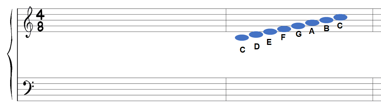 그러면, 3옥타브의 "도 - 높은도"는 높은 음자리표에서 다음과 같이 파란색(예시)으로 음계가 이어집니다.