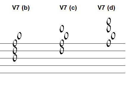 V7 코드는 3화음과 동일한 방법을 이용하여, 자리바꿈을 할 수 있습니다. 하지만 이번에는 음이 4개이므로 변형이 총 3가지가 가능합니다. 차례대로 b, c, d 기호를 사용합니다.