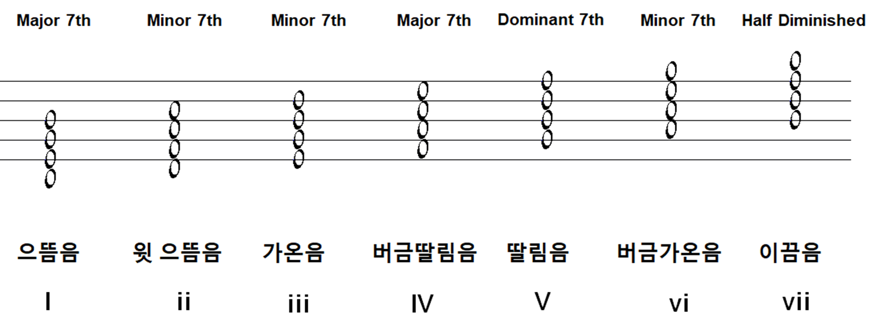 이전에 3화음과 동일한 방식으로 4화음도 가단조로 구성할 수 있지 않을까요? 이번에는 가단조로 구성한 4화음의 구성과 그 기호를 알아보도록 합시다.