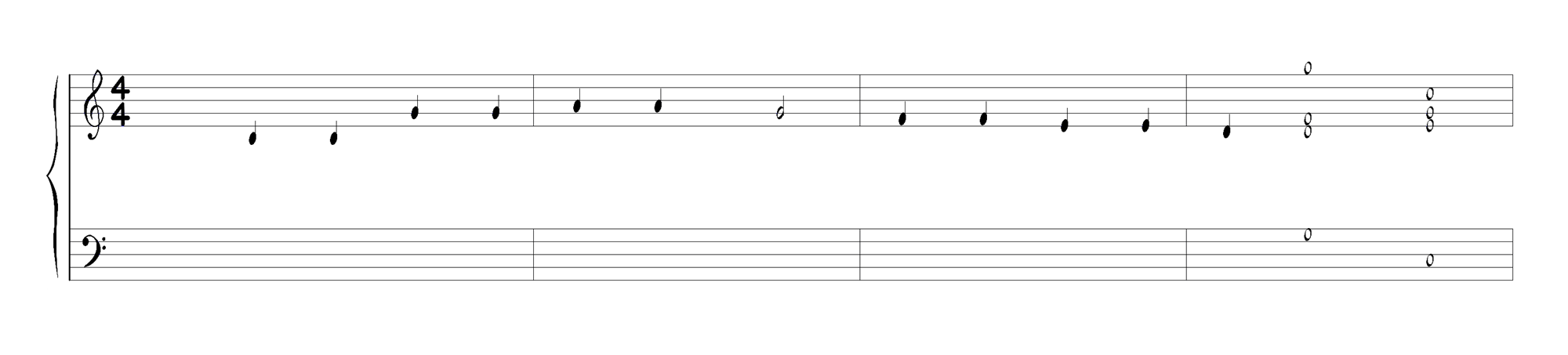 위의 악보는 사실 부분적이지만 첫 번째 줄과 세 번째 줄은 형식과 구조가 동일하답니다. 따라서 적절한 구절을 더 넣어준다면, 사실상 반짝반짝 작은 별 악보는 무한 반복이 가능하죠. 그렇다면 우리에게 필요한 것은? 바로 "강한 종지"입니다!