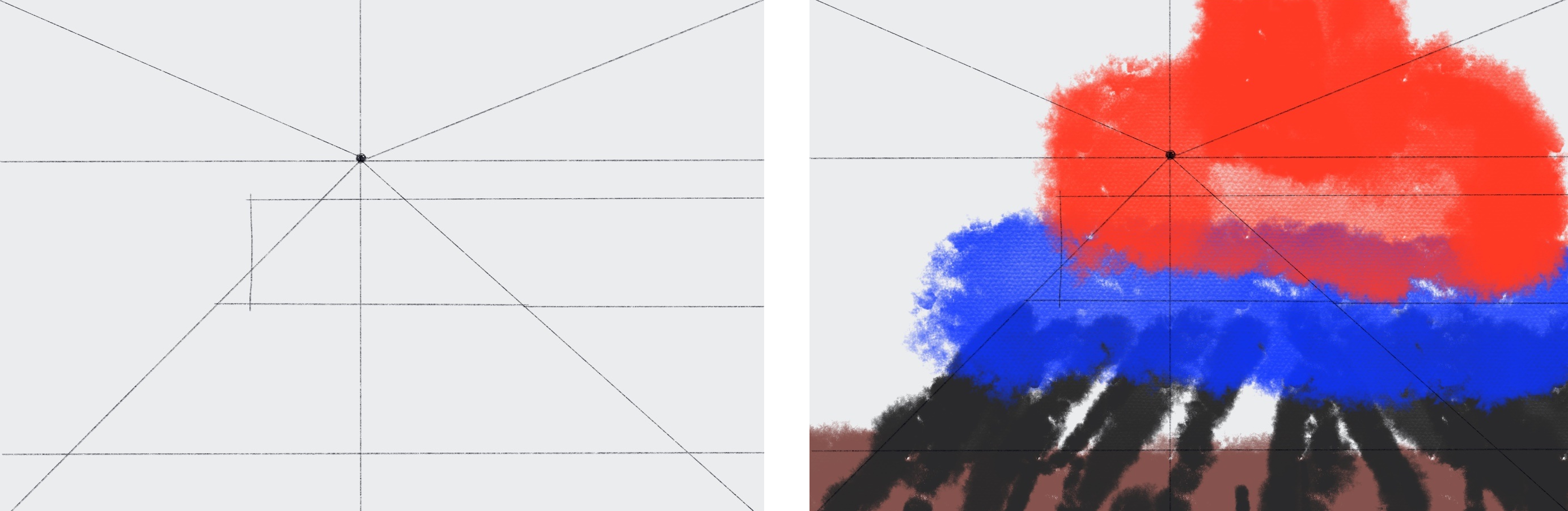그러고 나서 배경을 전반적으로 잘 보일 수 있도록 중앙에 1점 소실점을 배치하고 스케치를 다음과 같이 합니다.